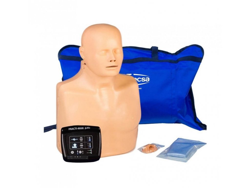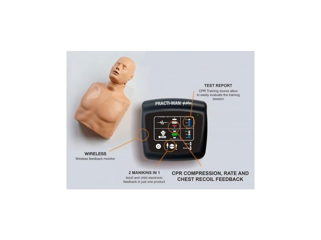 PRACTI-MAN PLUS - resuscitační figurína s elektronickým bezdrátovým vyhodnocením správného provádění srdeční masáže. Monitor sleduje rychlost a hloubku provádění, které vyhodnocuje v reálném čase a dále pak po 10 s po provedení nácviku KPR vyhodnotí celkové skóre masáže. Tento parametr je pro každého vyučujícího velmi důležitý.